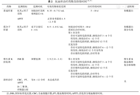 推荐初始治疗使用起效快的抗凝药物:普通肝素或低分子量肝素,随后用低分子量肝素或维生素K拮抗剂继续抗凝治疗。治疗期间监测活化APTT,相当于调节抗凝血因子Ⅹa水平。华法林是儿童最常用的维生素K拮抗剂,可以抑制凝血因子Ⅱ、Ⅶ、Ⅸ、Ⅹ,及蛋白C和蛋白S的促凝作用,该药半衰期较长,用药5~7 d方可达到治疗水平。直接抗凝剂是一类直接抑制抗凝血因子Ⅹa或凝血酶的药物,儿童患者应用研究有限,一般在推荐治疗存在禁忌的情况下,才考虑使用[24]。已批准的直接口服抗凝药物有:利伐沙班、阿哌沙班、达比加群[38]。
