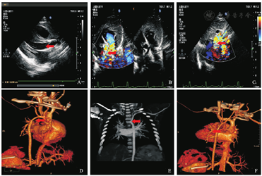 患儿,男,3个月,发现心脏杂音2月余;A.大动脉长轴显示主动脉窦部呈环形狭窄;B.大动脉短轴显示左右肺动脉内径狭窄,彩色多普勒显示高速湍流;C.胸骨上窝显示主动脉内径狭窄及高速湍流;D.心脏CT重建显示主动脉弓细小;E.心脏CT横断面图像显示主动脉内径小;F.心脏CT重建显示左右肺动脉及其远端弥漫性狭窄。