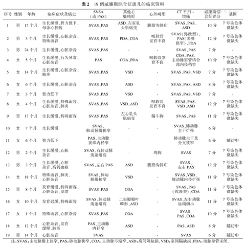 19例患儿中,男8例,女11例,中位年龄7个月(1~24个月),随访时间1~48个月,美国儿科学会威廉斯综合征评分:3例6分,4例7分,2例8分,3例10分,4例11分,3例12分,所有患儿的临床资料见表2。