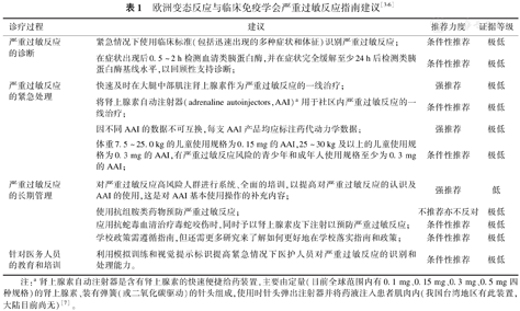 | 严重过敏反应的诊断 | 紧急情况下使用临床标准(包括迅速出现的多种症状和体征)识别严重过敏反应; | 条件性推荐 | 极低 |