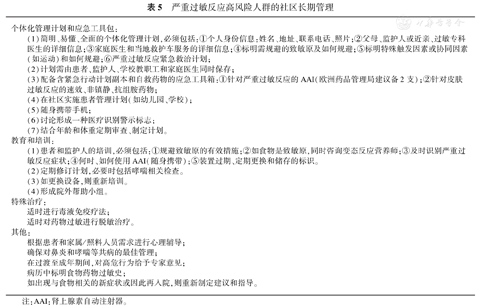 WAO 2020指南明确提出个体化管理是有严重过敏反应史(即使仅有1次发作)患儿长期管理的一部分,但未进一步详述(我国建议亦为简述),EAACI最新指南详细列出了社区长期管理的要点(表5),并对儿童个体化紧急救治计划举例说明。