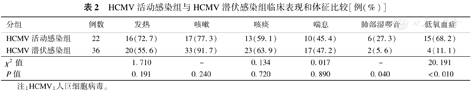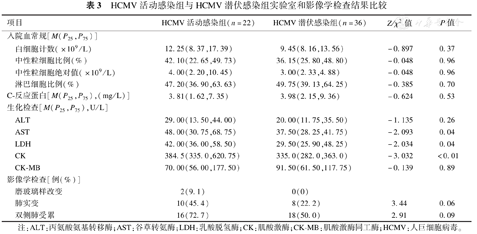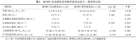 | 项目 | HCMV活动感染组(n=22) | HCMV潜伏感染组(n=36) | Z/χ2值 | P值 | |
