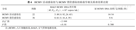 BALF HCMV DNA定量检测结果显示,HCMV活动感染组患儿BALF HCMV DNA拷贝数明显高于HCMV潜伏感染组(P<0.01);尿液HCMV DNA的阳性率差异无统计学意义(P>0.05)。见表4。