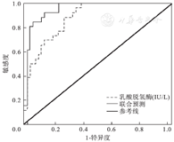 绘制LDH诊断PIBO的ROC曲线,如图1所示,当LDH=462 IU/L时,曲线下面积达到最大值为0.882,此时敏感度100.0%,特异度61.5%。当LDH=654 IU/L,敏感度73.1%,特异度80.8%;当LDH=900 IU/L,敏感度57.7%,特异度90.4%。通过发病年龄、LDH、静脉使用激素、使用人免疫球蛋白构建联合预测模型,P=ex/(1+ex)其中X=-5.23-0.06×发病年龄+0.005×LDH+ 1.89×静脉使用激素+2.27×使用人免疫球蛋白,其中P为发病概率,e为常数。ROC曲线如图1细实线所示,曲线下面积达0.954,该预测模型的整体最佳截断值为0.272,敏感度为92.3%,特异度为86.5%,约登指数为0.789,表明具有较高的预测价值。