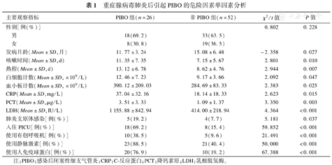 | 主要观察指标 | PIBO组(n=26) | 非PIBO组(n=52) | χ2/t值 | P值 | |