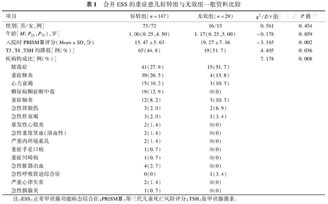 合并ESS的重症患儿好转组与无效组一般资料比较