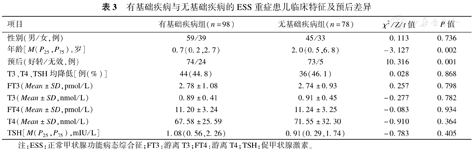176例合并ESS重症患儿中,有基础疾病者98例,无基础疾病者78例,常见的基础疾病包括:营养不良(31/98),心脏疾病(30/98),血液肿瘤(15/98),支气管肺发育不良(10/98),遗传代谢性疾病(8/98),慢性肾脏病(3/98),缺氧缺血性脑损伤(1/98)。有基础疾病组的中位起病年龄小于无基础疾病组(P<0.05)。有基础疾病组预后为无效的患儿比例(24.5%)明显高于无基础疾病组患儿(6.4%),差异有统计学意义(P<0.05)。有基础疾病组T3、T4、TSH均降低(伴或不伴FT3、FT4降低)的比例与无基础疾病组差异无统计学意义(P>0.05)。两组患儿的FT3、T3、FT4、T4、TSH水平差异亦无统计学意义(P>0.05)。见表3。