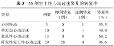 3例心房扑动婴儿均应用洋地黄联合美托洛尔控制心室率,治疗有效,心室率降至104~138次/min。10例单形态心动过速婴儿中,1例先后应用洋地黄、美托洛尔及胺碘酮均无效,改为索他洛尔有效,心室率降至92~116次/min。1例心房扑动,4例单形态心动过速及9例紊乱性心动过速婴儿治疗3~6个月转复窦性心律。3例应用胺碘酮联合洋地黄有效的阵发性室上性心动过速婴儿中,2例因心电图出现明显QT间期延长,改为索他洛尔治疗有效。1例1月龄男婴应用索他洛尔第6天,出现QT间期轻度延长,予药物减量后复查心电图正常。余未见明显药物不良反应。1例11月龄女婴为SVT合并B型心室预激,尝试多种药物联合控制无效,改为索他洛尔及抗心衰治疗2个月,仍发作SVT,行射频消融术根治后转复窦性心律。不同心律失常转复窦性心律情况见表3。55例婴儿随诊1~12个月,53例心脏彩超恢复正常,2例单形态心动过速仍有左室内径轻度增大,射血分数为55%~61%。