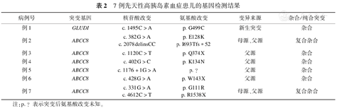 7例患儿的基因检测结果见表2,6例为ABCC8基因杂合突变,表现为多位点突变,1例为GLUDI基因突变,7例患儿中2例为复合杂合突变,余5例为杂合突变。
