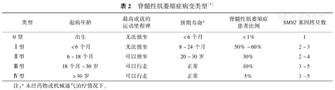 SMA是一种常染色体隐性运动神经元病变,主要是脊髓前角运动神经元进行性丧失而导致的进行性无力。SMA也是婴儿最常见的遗传性疾病死亡原因[2]。目前该病的分子机制已经基本阐明[3,4],主要是5号染色体长臂上SMN基因功能缺失突变,引起运动神经元进行性变性。SMN基因分为SMN1和SMN2两种,其中SMN2拷贝数与疾病严重程度呈负相关。临床上根据起病年龄、临床运动能力障碍严重程度将SMA分为5种类型,见表2[5]。