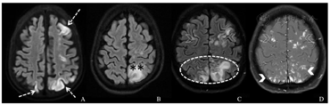 A:虚线箭头处为双侧大脑半球前、后分水岭区弥散受限,代表分水岭梗死。B:图示左侧顶叶皮质及皮质下白质内非特异性T2信号高信号融合区(**),左侧额叶后周区可见散在微小高信号灶。C、D:液体衰减反转恢复高信号在皮质和皮质下区域(虚线椭圆形)汇合,顶叶(实箭头)结节性增强灶,特征符合可逆后部脑病综合征;额叶左侧比右侧多见异常信号强度的散在区域(虚线箭头)。