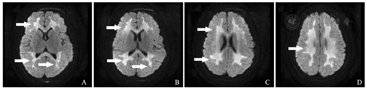 患儿,女,5岁,因呕吐、腹泻、反复惊厥致昏迷入院,诊断为脓毒症相关性脑病。图A~D为患儿入院当日MRI,扩散加权成像序列显示脑室周围白质对称性高信号,损伤区域包括半卵圆体和冠状辐射(白色箭头)。