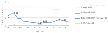 明确诊断后当日开始维甲酸20 mg每日2次诱导分化治疗,6月26日予MA方案治疗(米托蒽醌11 mg每日1次,共3 d,阿糖胞苷100 mg每12 h 1次,共7 d)。7月1日患者出现发热,体温38.5 ℃,无伴随症状,考虑感染,按粒细胞缺乏合并发热指南处理,先后予头孢哌酮钠舒巴坦钠、亚胺培南西司他丁钠、利奈唑胺联合头孢哌酮钠舒巴坦钠抗感染后,患者仍有发热,体温波动在37.0~38.9 ℃。7月8日予重组人粒细胞刺激因子125 μg皮下注射,每日1次以促进粒细胞恢复,重组人白细胞介素- 11 3 mg皮下注射,每日1次,以升高血小板。期间白细胞监测结果见图1。7月9日体温降至正常,未再发热。