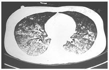本例患者DAH的病因尚不明确。体外实验显示重组人粒细胞刺激因子和维甲酸的联合应用可促进早幼粒细胞的分化[13]。经维甲酸诱导后分化成熟的早幼粒细胞会浸润到包括肺在内的多个器官[14]。故我们猜测本例DAH是由于化疗之后重组人粒细胞刺激因子的应用使得中性粒细胞快速恢复,并在维甲酸的作用下分化成熟并浸润于肺,引发了肺毛细血管及肺泡的炎性反应,最终导致DAH发生。