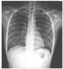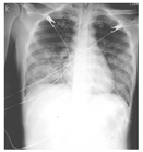 7月12日床旁胸部X线片(图3)示病灶好转吸收,完善风湿三项、免疫六项、自免十二项、结核抗体、抗中性粒细胞胞质抗体、磷脂综合征二项以及G试验,结果回报均阴性。至7月14日患者情况保持稳定,甲泼尼龙琥珀酸钠予逐渐减量,改为80 mg静脉滴注,每8 h 1次,并复查骨髓检查。7月15日床边胸片示病灶继续吸收,停无创呼吸机后复查血气仍提示Ⅰ型呼吸衰竭,深部痰培养出产超广谱β内酰胺酶的肺炎克雷伯菌(亚胺培南敏感),改亚胺培南西司他丁钠、伏立康唑维持,骨髓涂片报告当日回复:骨髓增生减低,G=41%,E=1.5%,G/E=27.67∶1。粒系增生减低,可见约7.5%原始、早幼粒细胞,破碎细胞易见,提示疾病未缓解,予亚砷酸10 mg静脉滴注,每日1次,继续诱导分化。7月18日情况稳定,甲泼尼龙琥珀酸钠继续减量,改为80 mg静脉滴注每日2次,其后每3~4天予减量1次,减至10 mg后维持至出院后。7月22日血常规:白细胞计数1.92 × 109/L,中性粒细胞计数1.56 × 109/L,血红蛋白83 g/L,血小板计数91 × 109/L,粒细胞缺乏恢复,情况稳定,停无创呼吸机。8月12日(亚砷酸治疗第29天)复查骨髓:骨髓涂片:骨髓增生活跃,粒系增生活跃,见个别早幼粒细胞,分叶略多于杆状核粒细胞。PML-RARα融合基因拷贝数<20,PML-RARα/ABL1<0.001。免疫残留:原始-前体细胞约占有核细胞的0.5%,CD34+细胞约占0.09%,未见免疫表型明显异常的细胞。评价疾病完全缓解。改甲泼尼龙10 mg每日1次口服维持治疗。8月11日复查胸部CT炎性反应基本吸收(图4),患者情况稳定于8月16日出院。8月22日复查胸部X线片(图5)心肺均未见病变,无呼吸系统后遗症,停甲泼尼龙。定期返院序贯诊疗,疾病均未复发,至今生存。