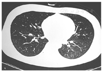 弥漫性肺泡出血是APL致命的并发症,典型的DAH表现为呼吸困难、咯血、贫血及弥漫性肺内浸润,若合并感染或存在系统性红斑狼疮等基础疾病时可有发热,出现急性呼吸衰竭。DAH发生的原因按机制可归为三类:(1)冷球蛋白血症、白塞综合征、各类小血管炎等导致中性粒细胞浸润引起肺泡毛细血管损伤,红细胞渗出,并有病理性血管炎。(2)凝血障碍、弥散性血管内凝血、系统性红斑狼疮等微观层面的上皮损伤导致红细胞的渗出,无病理性血管炎。(3)骨髓移植、化疗及放疗、感染、恶性肿瘤等导致的弥漫性肺泡损伤引发DAH,此种类型以肺泡内透明膜形成,肺间质水肿及微量炎性反应为特征表现,常导致急性呼吸窘迫综合征[5,6]。
