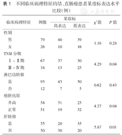 不同临床病理特征的结、直肠癌患者某指标表达水平比较(例)
