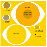 目前全球视力损伤人数22亿人(包括尚待解决的视力损伤人数),其中至少10亿人的视力损伤能被预防或尚待解决,这其中尚未得到戴镜矫正的屈光不正1.237亿、白内障6520万、青光眼6900万、角膜混浊420万、DR300万、沙眼200万、尚未得到戴镜矫正的老视眼8.26亿人。