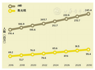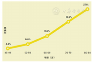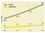 世界卫生组织(WHO)在2019年10月10日在"世界爱眼日"(每年十月的第二个星期四)前夕发布了《世界视力报告(World Report on Vision)》,该报告根据目前的研究数据汇总了目前全球导致视力损伤的几种重要眼病的估计人数。报告中称,2020年全球26亿人(95% CI:19.7~34.3亿)患有近视眼。2015年资料显示3.12亿(95% CI:2.65~3.69亿)的近视眼人群年龄在19岁以下(图1)。亚太地区高收入国家的近视眼总体患病率为全球最高,达53.4%,其次为东亚的51.6%。城市青少年近视眼患病率在中国达67%,在韩国高达97%。2010年、2030年全球近视眼分别为19.5亿、33.61亿,而高度近视眼分别为2.77亿、5.16亿(图2)。2015年全球老视眼患者18亿人(95%CI:17~20亿)。2020年全球7600万(95%CI:519~1117万)年龄40~80岁的人患有青光眼,而在2016年全球青光眼人数为6920万,2030年将达到9540万(图3)。青光眼患病率在非洲达4.7%,拉丁美洲及加勒比地区达4.5%。2016年全球30~97岁的人群中年龄相关性黄斑变性(AMD)人数1.784亿,2020年达1.956亿(95%CI:1.40~2.61亿),2030年将达到2.434亿(图3)。全球AMD患病率45~49岁为4.2%,而80~84岁达到27.1%(图4)。欧洲45~85岁高加索人AMD患病率高达57.4%。2016年全球18岁以上成年人糖尿病性视网膜病变(DR)患者1.46亿(根据2012年Yau等全球DR在糖尿病患者中患病率34.6%推算)。2019年全球沙眼患者250万人。全球翼状胬肉患病率10.2%,中国农村高达33%。40岁以上人群中干眼症患病率美国8%,中国超过30%。中国85~89岁的人年龄相关性白内障患病率达73%,是45~49岁的11倍。