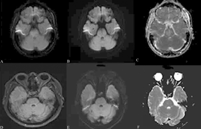 患者男性,37岁,因"头晕伴复视3 d"入院,治疗前头颅MRI示脑干右侧散在小斑片状异常信号,液体衰减反转恢复序列呈高信号(A),弥散加权成像呈低信号(B),表观弥散系数图呈稍高信号(C);出院1个月后复查MRI示病灶完全消失(D~F)