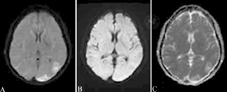 患者女性,18岁,因"G1P0孕40周"入院,产后大出血,行子宫动脉栓塞术后出现双目失明和癫痫发作,头颅MRI示双侧顶枕叶片样异常信号,液体衰减反转恢复序列呈高信号(A),弥散加权成像呈低信号(B),表观弥散系数图呈稍高信号(C)