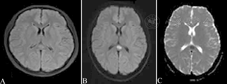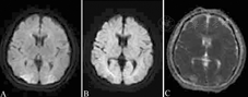 患者女性,20岁,因"发热伴头痛1 d"入院,头颅MRI示胼胝体压部结节状异常信号,液体衰减反转恢复序列呈稍高信号(A),弥散加权成像呈高信号(B),表观弥散系数图呈低信号(C)