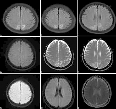 患者女性,18岁,因"G1P0孕40周,产程中出现四肢抽搐1 d"入院,头颅MRI示双侧顶枕叶斑片状异常信号,液体衰减反转恢复序列呈高信号(A~C),弥散加权成像呈稍低信号(D),表观弥散系数图呈高信号(E~F);出院1年后复查MRI示病灶完全消失(G~I)