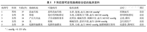 | 3 | 女性 | 18 | 产后大出血 | 子宫动脉栓塞术 | 皮质盲、癫痫发作、烦躁不安,血压162/102 mmHg | 止痉,降压 | 良好 |