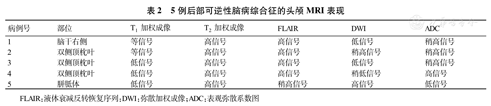 表1和表2分别对5例患者的基本临床资料和MRI表现进行了总结。