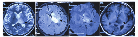 A~D分别提示左侧基底节T2、液体衰减反转恢复序列(FLAIR)、弥散加权成像(DWI)高信号以及T1低信号影,符合静脉性梗死改变,且位于直窦投影区(黑色箭头)