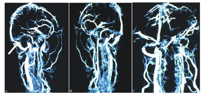 直窦、左侧横窦纤细显影,下矢状窦、大脑内静脉及大脑大静脉显影浅淡,左侧乙状窦、颈静脉较对侧血管细(白色箭头)
