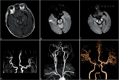 液体衰减反转恢复序列(A)和弥散加权成像(B~C)示双侧大脑脚及脑桥急性梗死灶。磁共振血管造影(D~E)和CT血管造影(F)示:(1)右侧大脑前动脉A1段未见确切显影,右侧大脑前动脉由前交通动脉供血;(2)双侧大脑后动脉闭塞;(3)右侧椎动脉优势型,基底动脉局部未见显影