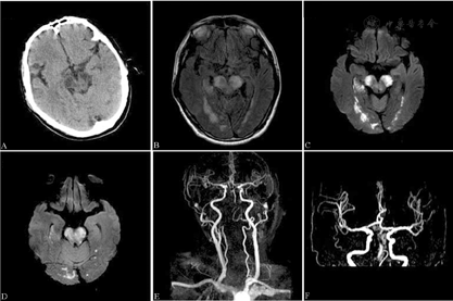 头颅CT扫描(A)示颅内多发低密度片状影,考虑脑梗死灶。头颅液体衰减反转恢复序列(B)和弥散加权成像(C、D)示双侧小脑半球、脑干、枕叶、丘脑等多发新近梗死灶改变。头颅磁共振血管造影(E、F)示:(1)双侧大脑后动脉纤细,显影不清;(2)右侧椎动脉V2~V4段以及左侧椎动脉V4段未见确切显影;(3)基底动脉纤细,显影浅淡