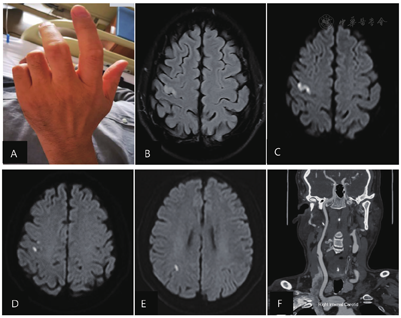 左手表现为"爪形手"(A);颅脑MRI液体衰减反转恢复序列示右侧中央前回手结节区高信号(B);颅脑MRI弥散加权成像示右侧手结节区病变(C)、右侧中央沟和中央后回病变(D)和右侧角回边缘病变(E);颅脑CT血管造影显示右侧颈内动脉分叉处斑块(F)