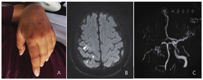 左手表现为"腕下垂"(A);颅脑弥散加权成像示右侧中央前回手结节区和中央后回病变(B);颅脑磁共振血管成像示右侧颈内动脉、大脑中动脉和大脑后动脉显影不良(C)