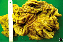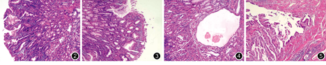 手术切除标本病理学检查:胃切除标本(图1):大弯长28 cm,小弯长13 cm,大网膜大小13.0 cm×8.0 cm×5.0 cm,距上切缘2.0 cm,下切缘8.5 cm,胃体至胃窦见弥漫性的颗粒状隆起,黏膜皱襞粗大,呈脑回样改变,胃黏膜厚1.5~2.0 cm,范围为17.0 cm×13.0 cm。胃体小弯侧见一溃疡,大小约1.2 cm×1.0 cm×0.5 cm,切面苍白,质地脆弱,距上切端3.0 cm,下切端12.0 cm。找到淋巴结:胃小弯11枚,直径0.3~0.8 cm;胃大弯7枚,直径为0.3~1.2 cm。直肠切除标本:肠管一段长11.0 cm,直径为3.0~3.5 cm,距一切缘2.5 cm,另一切缘5.0 cm处见一溃疡型肿瘤,大小5.0 cm×2.5 cm×1.0 cm,环绕肠管全周,切面苍白,质地脆弱,浸润肠壁全层。肠周淋巴结10枚,直径0.3~0.8 cm。镜检:胃小凹上皮细胞高度增生,小凹螺旋状扭曲,并向表面扩张,开口处覆盖有大量黏液,胃体腺减少、变形,腺上皮主细胞和壁细胞减少,可见腺体囊性扩张,黏液分泌亢进,间质水肿,炎细胞浸润。溃疡处肿瘤细胞呈浸润性生长,呈管状、乳头状排列,部分管腔内黏液潴留,细胞核深染畸形,伴异型性(图2,图3,图4,图5)。直肠肿瘤癌细胞核圆深染畸形、大小不一,呈索状、管状排列。病理学诊断:(1)胃体:胃Ménétrier病伴局部溃疡癌变,癌组织浸润胃壁黏膜下层。切缘未查见癌细胞。淋巴结查见癌细胞(胃体大弯0/7,胃小弯6/11)。(2)直肠:溃疡型中分化管状腺癌,浸润肠壁全层,切缘未见癌细胞。淋巴结查见癌转移(直肠1/10)。