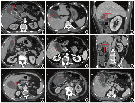 (5)其他积液征象:24例患者胆囊周围脂肪间隙密度增高,部分呈线条状、索条状改变。除"堰塞湖征"积液外,1例患者肝包膜下见少量固定弧形积液影,1例腹膜内见少量固定条形积液影,4例胆囊与肝脏间见积液影,密度明显高于胆汁,6例见肝脓肿形成。