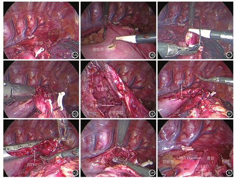 改良自牵引Overlap法胸腔内吻合:(1)暂不离断食管,套线结扎食管,利用结扎线作为牵引,下拉食管(图1A)。(2)于管状胃近系膜处开一小孔(图1B),开口尽量小,刚好放进吻合器即可,检查无假道、无出血。将食管顺时针旋转45°,于食管左后侧壁预离断处开一小孔(图1C),同样开口尽量小,刚好放进吻合器即可。(3)上提管状胃,将吻合钉匣伸入管状胃,将吻合器钉座伸入食管内,闭合后激发直线切割闭合器,应用自牵引Overlap吻合法行食管胃侧侧吻合术,形成线性食管胃吻合口(图1D)。(4)查看吻合口情况(图1E),直视下检查吻合口有无出血和假道形成,放置鼻胃管。(5)用V-loc缝线将食管胃侧侧吻合术形成的共同开口缝合后提起,并向右侧牵引(图1F)。(6)置入腔镜直线切割闭合器,关闭共同开口,尽可能保证吻合器垂直于食管长轴方向(图1G),形成食管胃Overlap三角形吻合口。(7)最后离断食管(图1H)并检查吻合口(图1I),检查术野有无出血。(8)观察孔留置胸管,副操作孔留置乳胶管至食管床(吻合口下方),关闭胸部各切口。