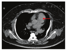 患者男,38岁。因"外伤至阴囊、双下肢肿胀并疼痛3 d余"就诊我院急诊科,急诊科给予对症治疗后好转。因患者为重度肥胖症,我科参与会诊后,收治拟行减重手术治疗。患者入院体格检查:体质量155 kg,身高169 cm,BMI 54.27 kg/m2,腹部膨隆,呈蛙状腹,腹软,全腹无压痛反跳痛,墨菲征阴性,肝、脾、肾区无叩击痛,未闻及肠鸣音。双下肢轻度凹陷性水肿。阴囊水肿。全身可见多处皮肤褶皱处色素沉着、角化过度。血常规及实验室指标检查:RBC 8.31×1012/L、Hb 195 g/L、尿酸670 μmol/L、Alb 29.9 g/L、D-二聚体1.26 mg/L。激素指标检查:睾酮97.31 pg/mL、雌二醇54.07 pg/mL。营养指标检查:血清转铁蛋白3.83 g/L、血清前白蛋白0.091 g/L、糖化血红蛋白7.10%、脑钠肽961 pg/mL。血气分析检查: pH 7.21、二氧化碳分压(PaCO2)95.5 mmHg(1 mmHg=0.133 kPa)、氧分压(PaO2)31.8 mmHg、血氧饱和度45.8%、实际碳酸氢根42.7 mmol/L、碱剩余值10.0。口服糖耐量试验血糖值:0.5 h为5.64 mmol/L、1 h为8.14 mmol/L、2 h为8.92 mmol/L、3 h为6.29 mmol/L。血清C肽1.33 ng/mL。胸部CT检查:(1)双侧肋骨多发陈旧性骨折。(2)双肺上叶、右肺中叶斑片状渗出实变影,考虑感染。(3)心脏增大、肺动脉高压、心包少量积液(图1)。(4)双侧胸膜增厚。(5)腹壁皮肤脂肪层浑浊,双侧腋窝见肿大淋巴结。腹部CT检查:(1)肝左叶低密度灶。(2)脾大。肺动脉造影检查:左肺下叶后基底段分支内充盈缺损。考虑为肺栓塞,肺动脉高压,双肺炎症。心脏超声检查:左右心房、右心室增大,主动脉增宽、室间隔增厚,左心室舒张功能减低。多导睡眠监测(polysomnography,PSG)检查:重度阻塞性睡眠呼吸暂停低通气综合征(obstructive sleep apnea hypopnea syndrome,OSAHS),重度夜间低通气综合征,呼吸紊乱指数(apnea hypopnea index,AHI)81.5次/h、夜间最低血氧饱和度58.0%。