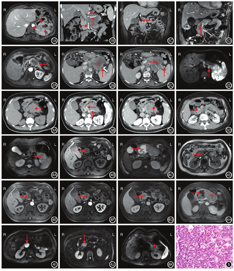 21例患者中,7例行单纯CT检查,11例行单纯MRI检查,3例行CT联合MRI检查。(1)肿瘤形状:21例患者肿瘤均为单发,其中17例呈圆形或类圆形,4例形态不规则呈团块状。(2)肿瘤发生部位:21例患者中,胰头部6例,胰头部和胰体部2例,胰体部2例,胰体尾部4例,胰尾部4例,壶腹部3例。(3)肿瘤最大径为(43±29)mm,范围为11~129 mm。(4)邻近器官侵犯:21例患者中,10例侵犯邻近器官,其中2例侵犯邻近胃、脾及左侧肾上腺(图1A),4例侵犯十二指肠,3例侵犯十二指肠及胆总管,1例侵犯脾脏。(5)血管侵犯:12例患者侵犯脾动脉、脾静脉,其中1例同时侵犯肝总动脉和肠系膜上动脉(图1B),1例同时侵犯腹腔干根部。(6)胰管和胆管侵犯:8例患者发生胰管和胆管扩张,其中4例胆管及上游胰管扩张(图1C、图1D),4例单纯胰管扩张。(7)淋巴结转移:2例患者肿瘤周围淋巴结肿大(图2)。(8)其他情况:7例患者肿瘤中心伴囊变坏死。4例患者胰腺实质萎缩(图2)。2例患者脾静脉瘤栓形成(图2)。2例患者合并囊肿。1例患者肝脏多发转移。