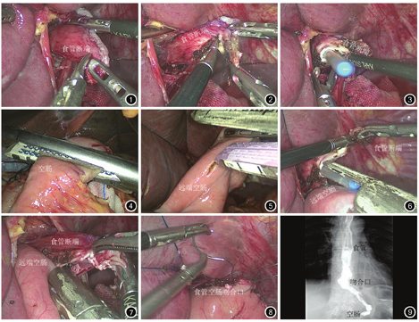 用直线切割闭合器离断食管后,将切除的全胃标本置入标本袋,通过腹上区或绕脐3~5 cm的小切口取出。将食管顺时针旋转90°,使食管切割闭合线呈矢状位(图1)。根据操作的空间需要离断部分膈肌脚或游离左肝韧带。于食管断端右后壁用超声刀或电铲平行食管切割闭合线自背侧向腹侧全层切开显露黏膜(图2),并利用术中胃管引导确认吻合通道(图3)。小切口或腹腔镜下距屈氏韧带20 cm处离断空肠及其系膜(图4),于远端空肠距断端5 cm处对侧系膜缘处开一小孔,从左上方的12 mm Trocar置入45 mm直线切割闭合器(图5)。将远端空肠经横结肠前或横结肠后上提至靠近食管下段。从左上方或左下方的12 mm Trocar置入45 mm直线切割闭合器,使食管右后壁和空肠对系膜缘侧靠拢,形成食管于左上方、空肠于右下方的结构。将直线切割闭合器两臂伸入食管和空肠的开孔,钉仓面经空肠开口置入,非钉仓面在胃管引导下经食管开口置入(图6),行食管空肠侧侧吻合术(图7)。吻合时须调整好方向,勿损伤空肠系膜血管。仔细检查确认吻合线完整,无出血、穿孔、假道等,然后采用腹腔镜下倒刺线手工缝合关闭共同开口(图8)。空肠-空肠侧侧吻合可根据需要在腹腔镜下或通过小切口辅助完成。各吻合口浆肌层加强缝合,关闭Peterson裂孔,包埋十二指肠残端。于剑突下或脐孔上正中做3~5 cm辅助切口,切口保护圈保护切口后取出标本。常规置入空肠营养管,根据术中情况放置引流管。术后造影检查结果示吻合口通畅良好(图9)。