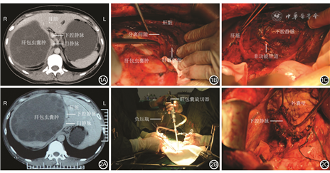 1.外膜内外囊完整切除术:全身麻醉成功后,常规消毒铺巾,取腹上区“┛”形切口,充分暴露并游离肝脏,手法需轻柔,避免游离肝脏周围韧带及粘连而导致肝包虫囊肿破裂。于肝包虫外囊与肝实质交接处切开肝被膜,用电刀头轻轻分离,找出外囊与肝脏之间的间隙,然后沿此间隙以“剥桔子”的方式逐渐将肝包虫外囊完整剥除,在剥离过程中仔细辨认肝包虫外囊与外膜以及被肝包虫囊肿压迫的肝内管道。如肝内管道无功能可直接结扎离断(直接连接肝包虫囊肿的胆管或受压迫闭死的胆管等),如仍有功能(有运输胆汁功能的胆管等),需将外膜及各管道完整保留在肝实质一侧,避免损伤,减少出血。手术进行至解剖肝包虫囊肿与下腔静脉紧贴处时,用电刀头将下腔静脉向健侧尝试推移分离,操作需轻柔,直至将肝包虫囊肿完全从下腔静脉分开,检查创面无出血及胆汁漏,残腔下(创面下)放置引流管。如术中发现完整切除困难,或发现与重要血管、胆管粘连严重,需行外膜内外囊部分切除术或外膜内外囊完整切除联合下腔静脉部分切除术(图1)。