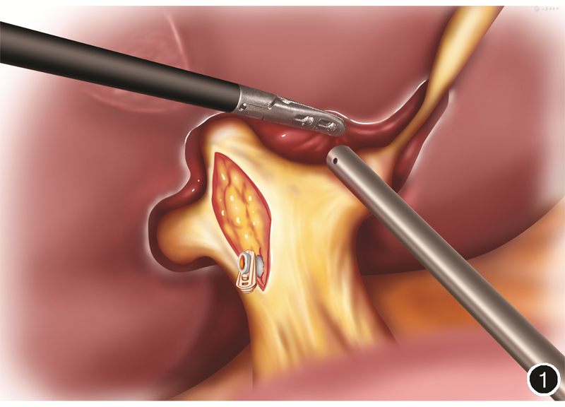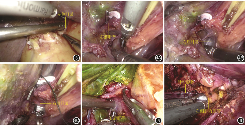 笔者团队采用此入路顺利完成多例腹腔镜解剖性肝叶切除术,涵盖肝左叶、右前叶及右后叶的全部肝叶,其中包括原发性肝癌、肝内胆管结石、转移性肝癌等多种疾病,均在不破坏肝实质前提下经此入路实现各叶肝蒂的解剖分离及处理(图3, 4, 5)。随后按照Takasaki教授的理念进行Glisson蒂横断式肝切除术,初步证明该入路有非常高的可行性及可重复性。