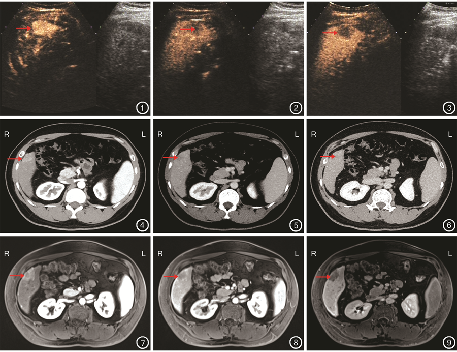 小肝癌超声造影、增强CT、增强MRI检查不同时期强化方式分布见图1, 2, 3, 4, 5, 6, 7, 8, 9。