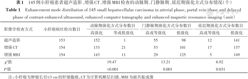 Enhancement mode distribution of 145 small hepatocellular carcinoma in arterial phase, portal vein phase and delayed phase of contrast-enhanced ultrasound, enhanced computer tomography and enhanced magnetic resonance imaging(unit)