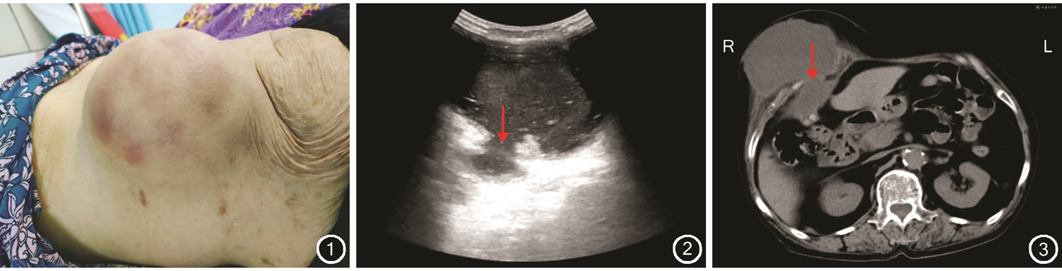 患者女,85岁,2022年6月因右侧腹壁包块反复发热伴有轻度疼痛半月入院。2022年4月患者家属发现患者右侧腹壁有一包块,无腹痛、腹胀等不适,未予重视,随后包块逐渐增大。体格检查结果显示右侧腹壁可触及长径约10 cm包块,质地柔软,边界清楚,表面皮肤红肿,轻压痛,无波动及搏动(图1)。超声检查结果显示右侧腹壁可见约98 mm×85 mm不均质混合回声包块,内部透声差,其内充满密集点状回声及强回声伴声影,加压探头可见流动,腹壁连续性中断可见瘘口与腹腔相通(图2);肝胆超声检查结果显示未见正常胆囊图像;彩色多普勒血流显像检测结果显示包块内未见彩色血流信号。超声检查诊断为右侧腹壁囊性包块(胆囊结石、胆囊腹壁瘘不排除),建议进一步检查。腹部CT检查结果显示胆囊疝伴多发结石、炎症可能(图3)。