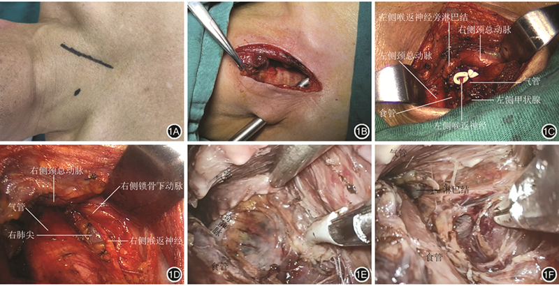 笔者中心也对常规IVMTE进行改良。见图1。以左侧颈部切口为主要操作路径,右侧微小切口作为辅助路径,其手术过程如下:在左侧胸锁乳突肌前缘行6~7 cm切口,逐层切开皮肤及皮下组织,钝性游离肌群,显露甲状腺下极、气管及双侧喉返神经,清扫双侧颈部淋巴结。右侧胸锁乳突肌前缘平左侧切口中点处行微小切口,置入5 mm Trocar,左侧切口置入切口保护套,并外套手套建立封闭腔隙,手套指头处连接3个12 mm Trocar,纵隔内充气(8 mmHg,流量为10 L/min),左侧置入吸引器、腔镜镜头、马里兰钳,右侧置入拉钩。沿食管壁按照“左-前-右-后”的顺序向下游离至隆突水平甚至下肺静脉水平,并清扫双侧喉返神经旁淋巴结、食管旁淋巴结、气管支气管旁淋巴结(No.106tbL组)、隆突下淋巴结。笔者认为:经左侧颈部切口直视下清扫双侧喉返神经旁淋巴结没有技术难度。吸引器和拉钩配合可以获得较满意的显露,并解决烟雾对手术区域的干扰,降低手术难度。