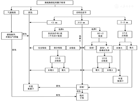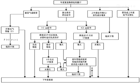 (1)新病灶疑似炎性病变:抗炎治疗后1~2个月LDCT复查:①复查时如果病灶吸收,进入年度LDCT;②复查时如果结节部分吸收,影像随诊至消失或稳定,进入年度LDCT;③复查时如果病灶未吸收或增大,行PET-CT检查,此时如果怀疑肺癌可能性小则建议3个月后复查LDCT,如果怀疑肺癌可能性大则建议活检或外科手术。(2)新病灶不似炎性病变:①实性或部分实性结节,参考上述基线LDCT随诊方案;②非实性结节,参考上述基线LDCT随诊方案。