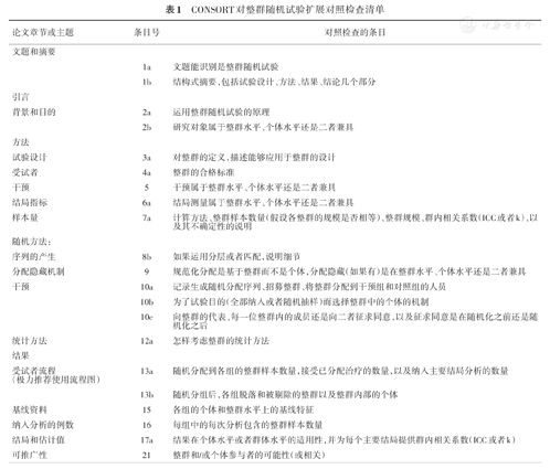 CONSORT声明是为报告个体随机对照试验而开发的,但已被Campbell等人扩展应用到整群随机试验。扩展CONSORT声明考虑了整群随机试验的特殊性,对整群随机试验应该报告的清单进行了扩展,该指南同时推荐使用流程图来显示受试者从分配到最后分析的流程。对整群随机试验的CONSORT扩展清单见表1,具体内容见http://www.consort-statement.org/。