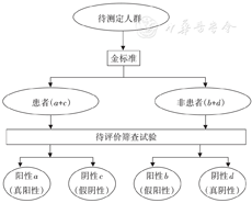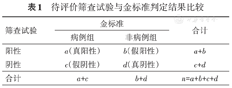 表1中,a(真阳性)是指经金标准确诊的病例中,待评价筛查试验检出的阳性例数;b(假阳性)是指经金标准确诊的非病例中,待评价筛查试验检出的阳性例数;c(假阴性)是金标准确诊的该病病例中,待评价筛查试验检出的阴性例数;d(真阴性)是指在金标准确诊的非病例中,待评价筛查试验检出的阴性例数。第一列a+c表示为所有患病人数,第二列b+d表示所有未患病人数。